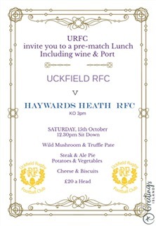 Come and join us on Saturday 15th October as URFC 1sts take on Haywards Heath RFC and in a double header URFC 2nds take on Crawley RFC. It promises to be a great day of rugby so why not join us for a pre match meal to kick start a great afternoon. 3 course meal with wine and port. Details attached.