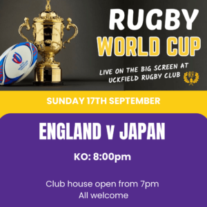 Come and watch the England vs Japan game live on the big screen at Uckfield Rugby Club. All welcome. Clubhouse open from 7pm. Kickoff at 8pm.